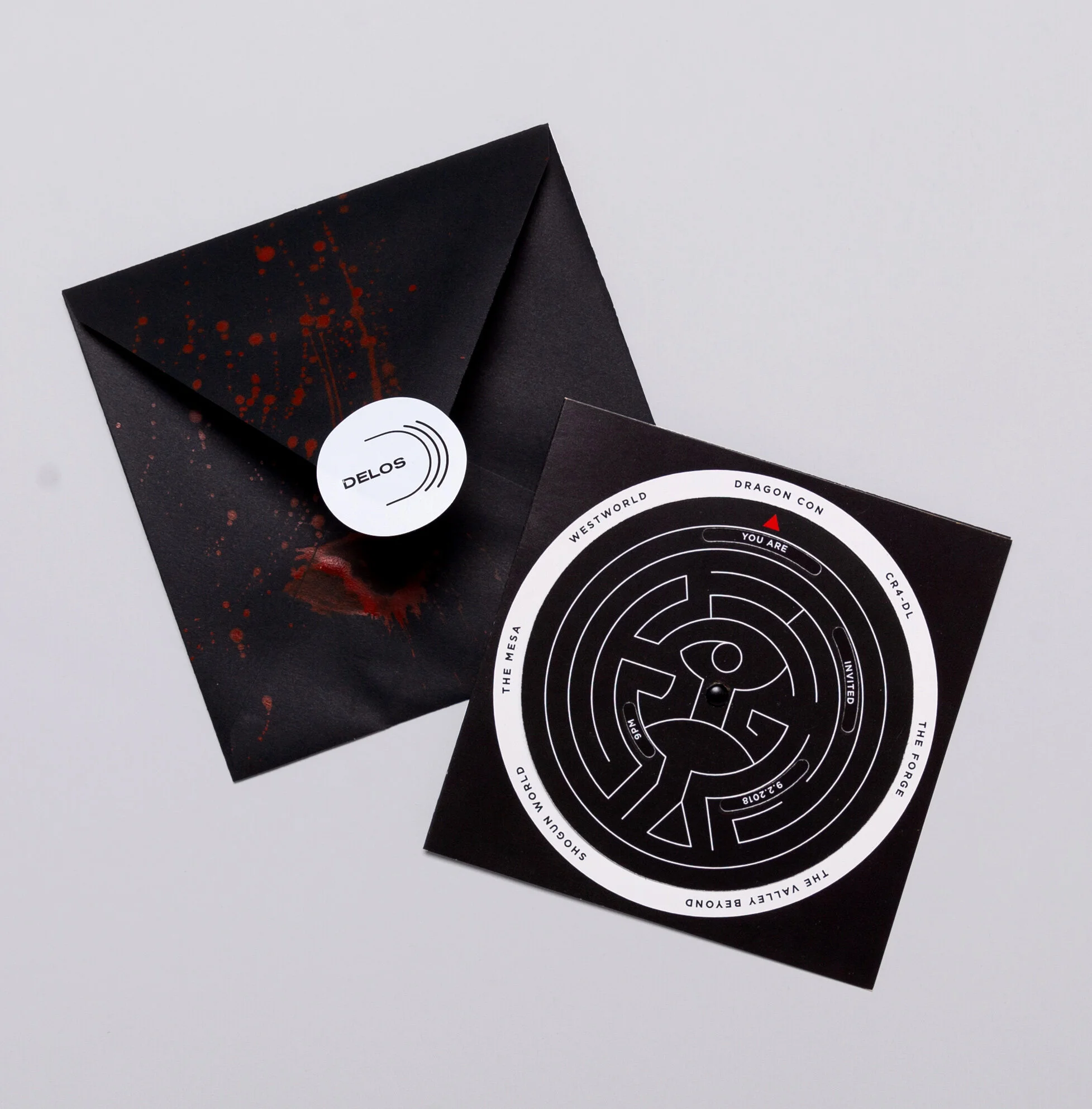 For 2018, I put together “decoder ring” style invites based on the maze from HBO’s Westworld. I put 100 of these together in my apartment, including creating the blood splatter effect on all of the envelopes. The paper wheels were plotter cut for me by a close friend.